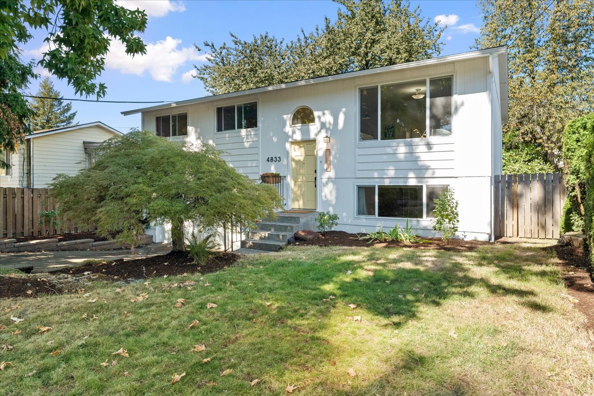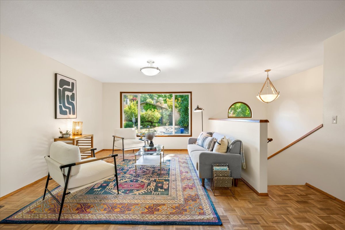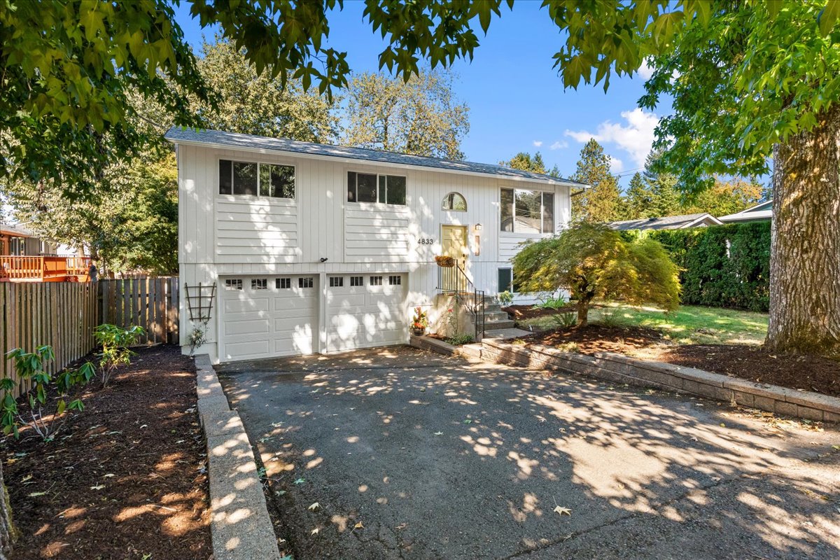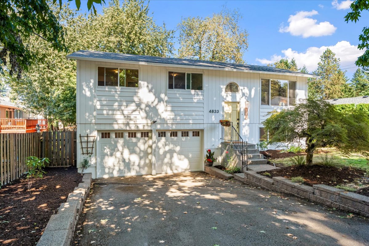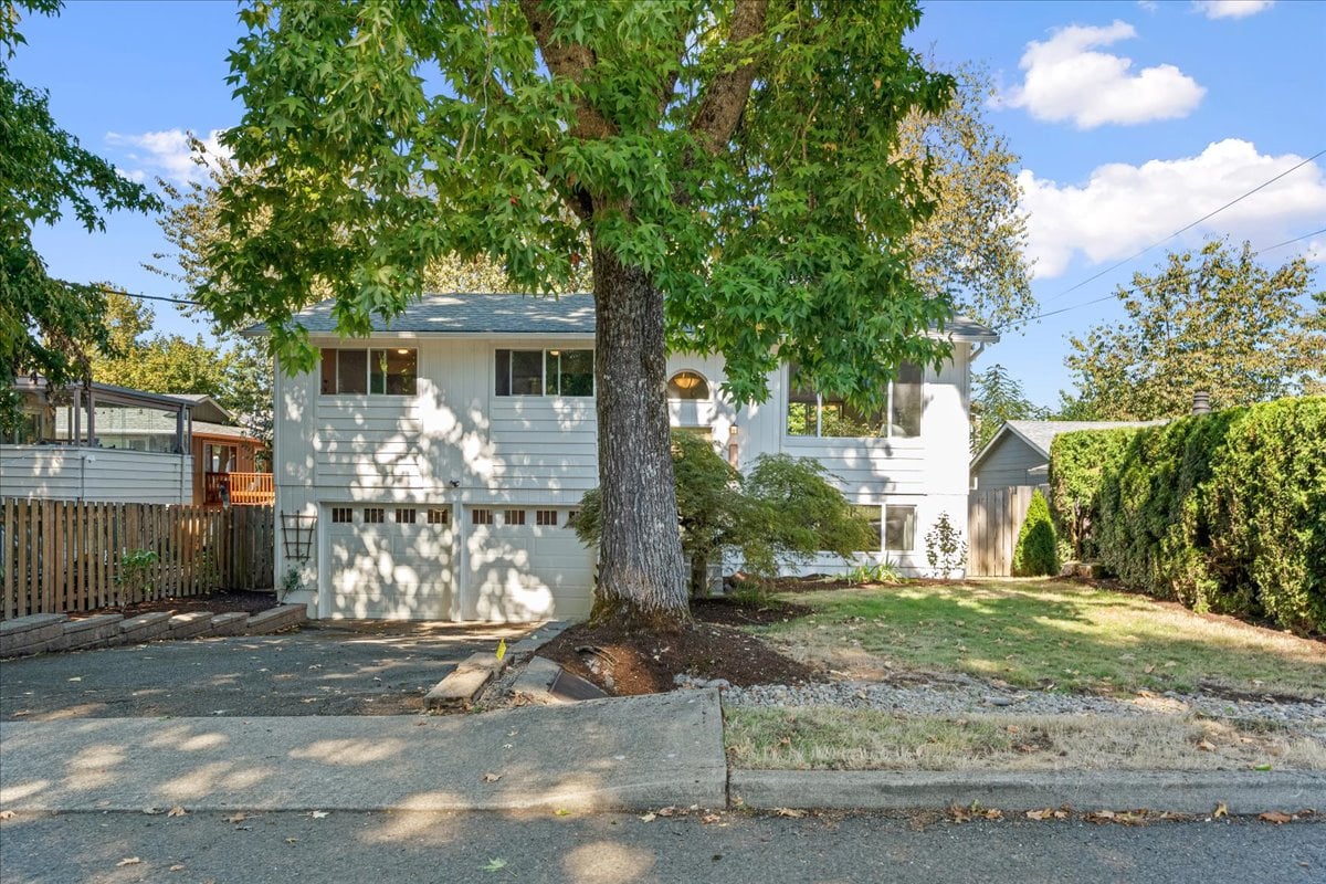Located in the close-in Southwest neighborhood of West Portland Park, you’ll love being near local parks, shops, quick I-5 access, transit access and close to PCC Sylvania. Inside you are greeted with an open floor plan and parquet wood floors. Main living area has lots of natural light from the new front window. Also a large dining room with a slider to spacious deck and an open kitchen with gas cooking. The remodeled primary/hall bath features an updated vanity with extra built-in storage and a nice subway tiled tub-shower. Downstairs has a huge bonus room with built in shelving. A great flex space for a family room, game room, 4th bedroom, office, you name it! The many recent updates make this move-in-ready! Those updates include—newer HVAC with central air (2020), updated vinyl windows, fresh paint inside and out, new carpet, and new garage doors (2025), Roof (2017). Outside has a spacious deck overlooking the fenced yard with a storage shed and mature plantings. Talking about storage... check out the oversized garage with nearly four-car capacity! Stylish, comfortable, and conveniently located, this home is ready to welcome its next owner.