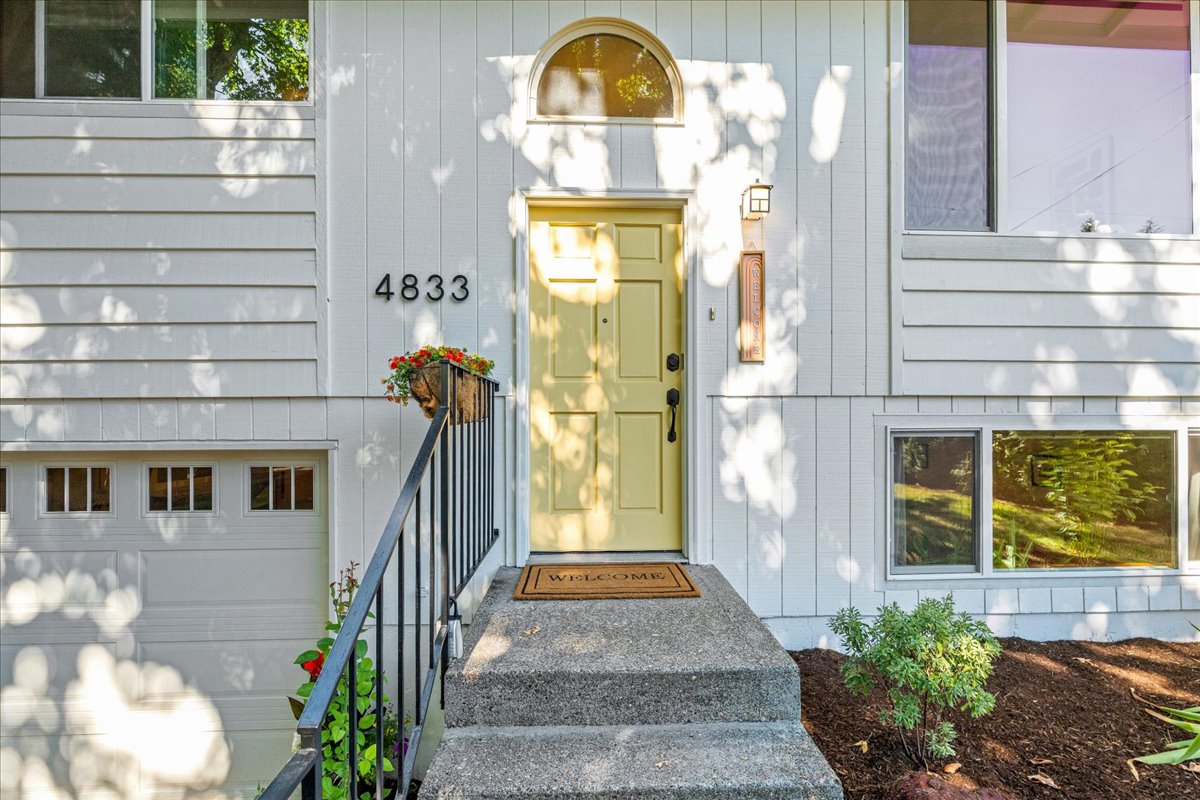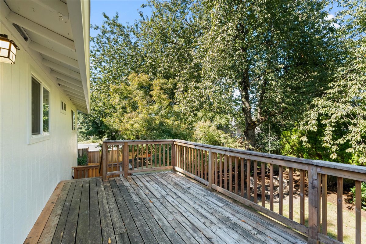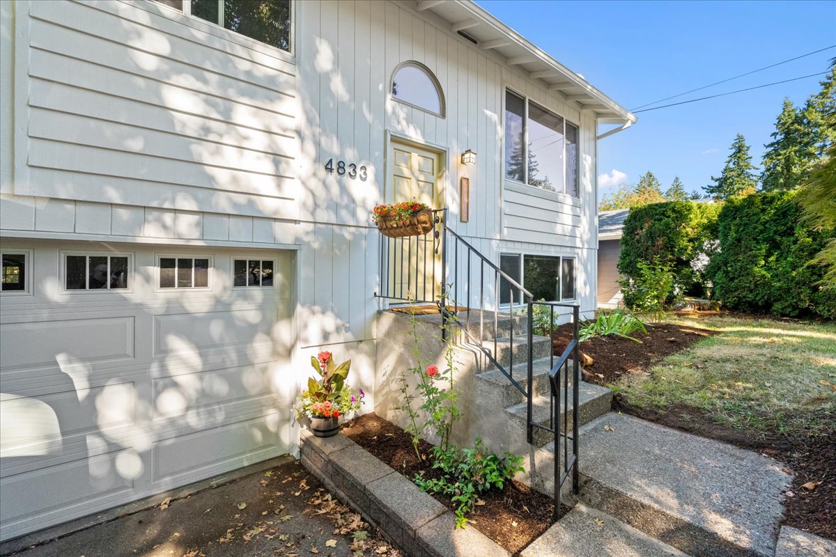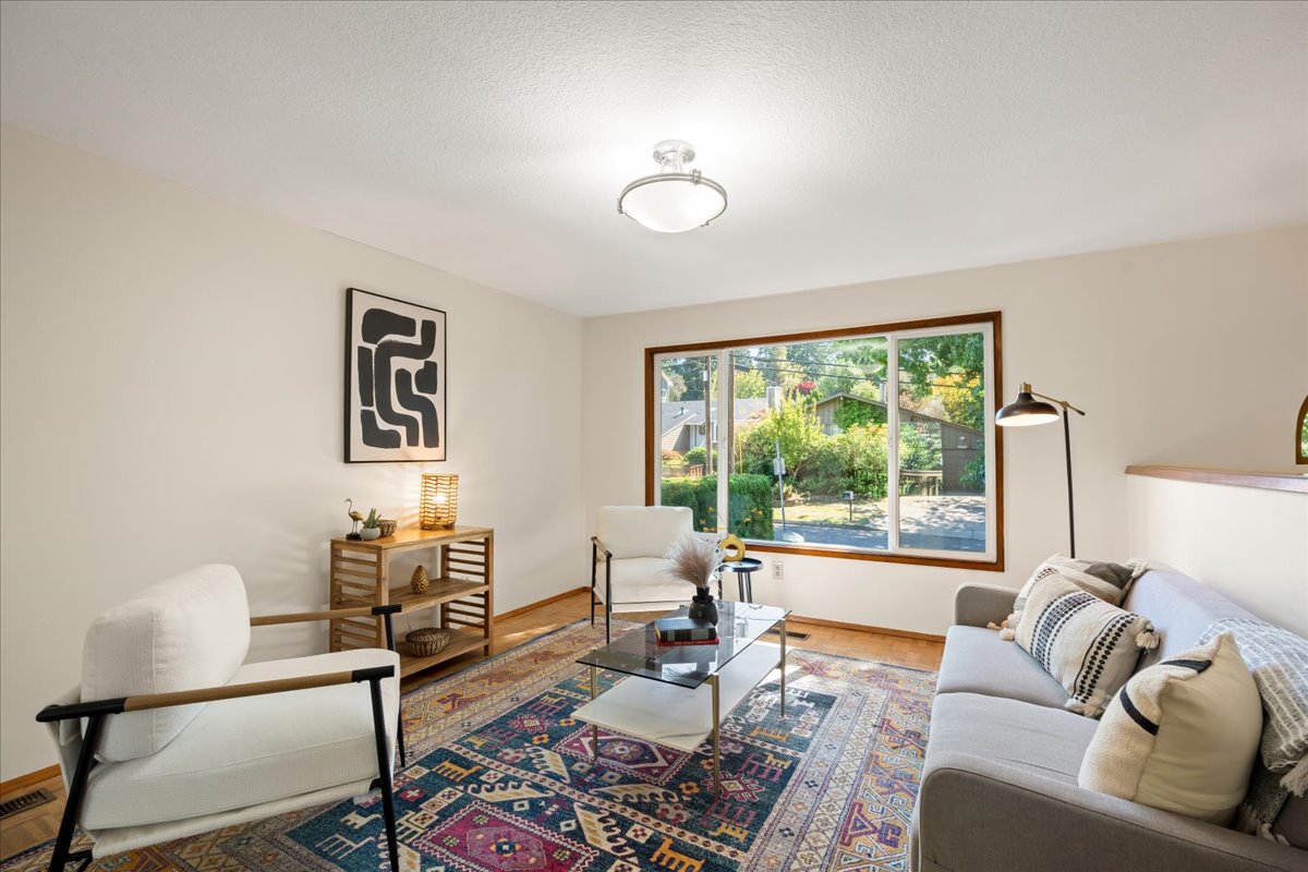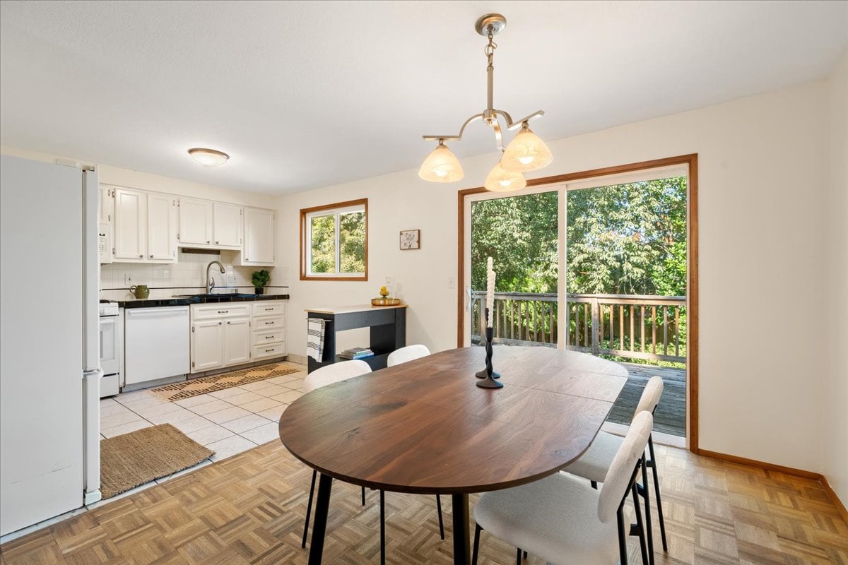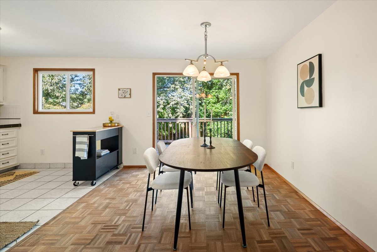 Located in the close-in Southwest neighborhood of West Portland Park, you’ll love being near local parks, shops, quick I-5 access, transit access and close to PCC Sylvania. Inside you are greeted with an open floor plan and parquet wood floors. Main living area has lots of natural light from the new front window. Also a large dining room with a slider to spacious deck and an open kitchen with gas cooking. The remodeled primary/hall bath features an updated vanity with extra built-in storage and a nice subway tiled tub-shower. Downstairs has a huge bonus room with built in shelving. A great flex space for a family room, game room, 4th bedroom, office, you name it! The many recent updates make this move-in-ready! Those updates include—newer HVAC with central air (2020), updated vinyl windows, fresh paint inside and out, new carpet, and new garage doors (2025), Roof (2017). Outside has a spacious deck overlooking the fenced yard with a storage shed and mature plantings. Talking about storage... check out the oversized garage with nearly four-car capacity! Stylish, comfortable, and conveniently located, this home is ready to welcome its next owner.